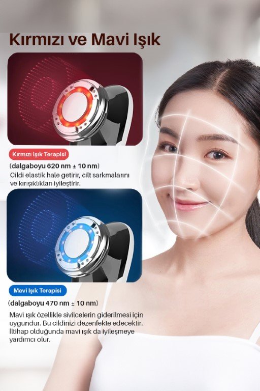 🧡 Bu cihaz, mavi ve kırmızı LED ışıklı ışık terapisi sunar.
